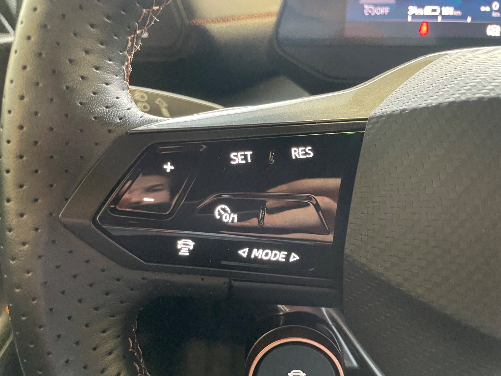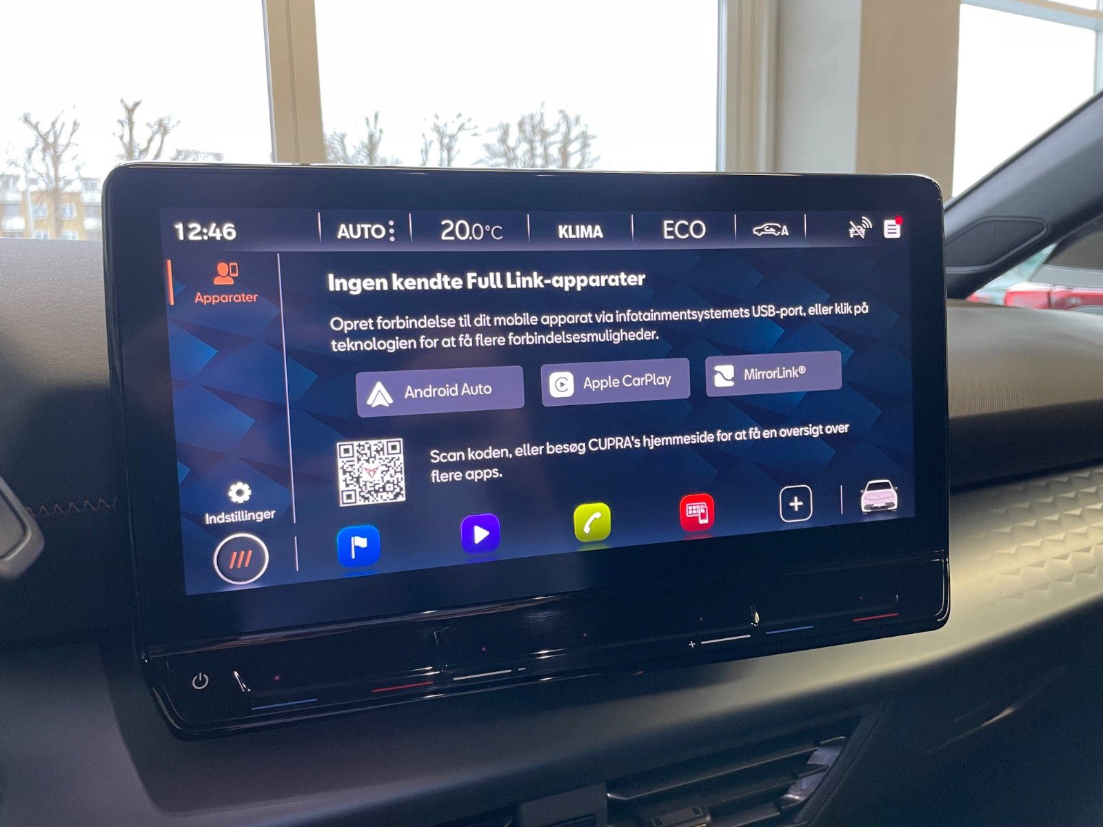 Nævneværdigt udstyr: - 19" Originale Cupra Alufælge - Adaptiv fartpilot - Bakkamera -Navigation - P-sensor for & bag - Rat m. varme - Fuld LED Forlygter - Apple CarPlay & Android Auto - Bluetooth - Klimaanlæg, 2-zoner - Trådløs mobilopladning - Laneassist, skiltegenkendelse og frontassist - Isofix